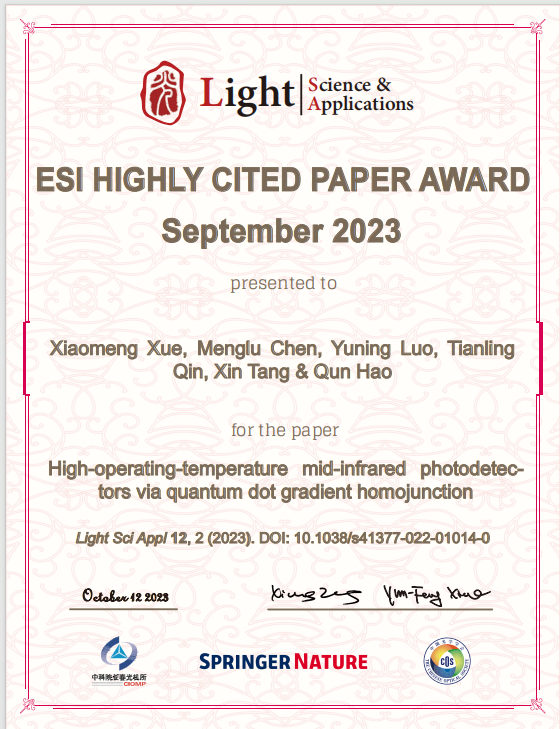 pg娱乐电子游戏郝群教授团队在室温运行中波红外探测器研究方面取得了突破性的进展,相关论文于2023年1月发表于光学顶刊Light:Science & Applications,获得封面论文。近日该论文入选ESI高被引。 (https://www.nature.com/articles/s41377-022-01014-0)