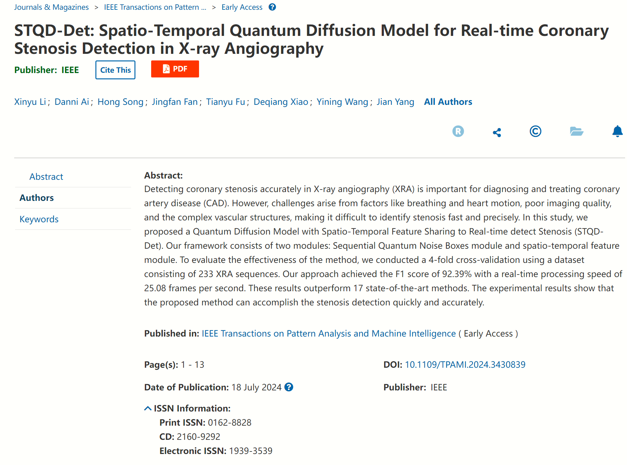 近日,pg娱乐电子游戏杨健教授、王涌天教授科研团队与北京协和医院王怡宁教授团队合作,提出了一种基于时空量子扩散模型的X射线视频序列图像冠脉狭窄检测方法,首次实现了冠状动脉狭窄实时检测。相关成果已以“STQD-Det: Spatio-Temporal Quantum Diffusion Model for Real-time Coronary Stenosis Detection in X-ray Angiography”为题发表在国际顶级期刊《IEEE Transactions on Pattern Analysis and Machine Intelligence (TPAMI)》。IEEE TPAMI作为人工智能、模式识别、图像处理等领域的顶级权威期刊,其影响因子为20.8,同时也是中国计算机协会(CCF)推荐的人工智能领域A类期刊。该论文第一作者为pg娱乐电子游戏博士研究生李欣宇,通讯作者为艾丹妮副教授、王怡宁教授和杨健教授。