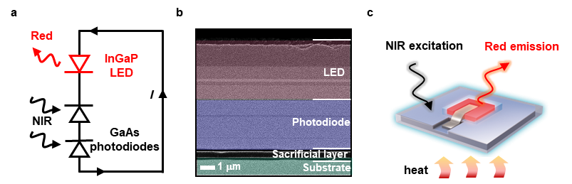 图1基于光电半导体异质结构的上转换设计的(a)电路图;(b)外延结构扫描电镜(SEM)照片;(c)器件示意图。