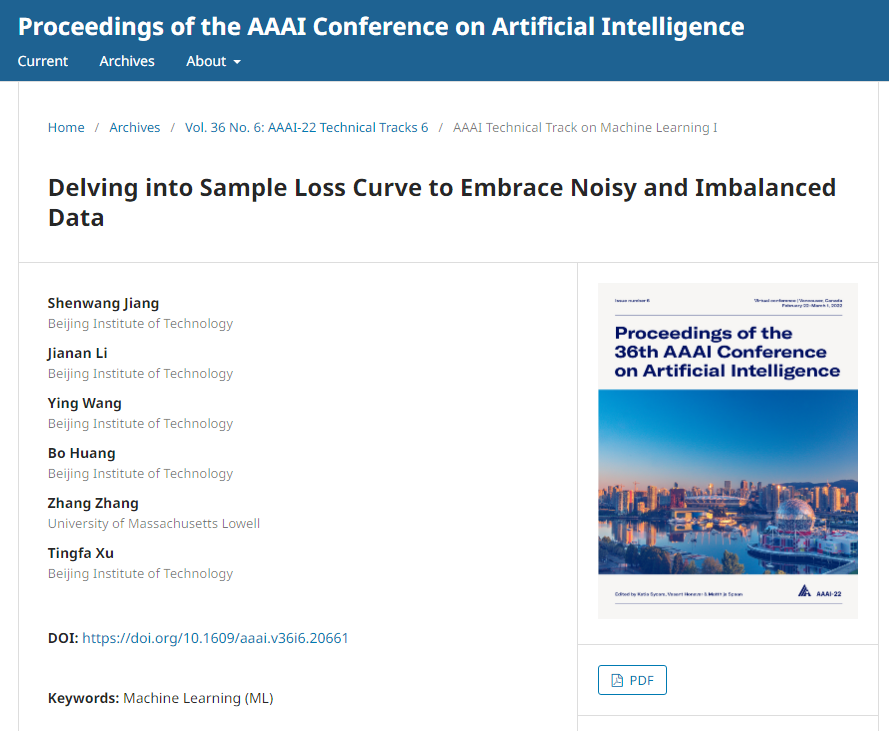 近日,pg娱乐电子游戏许廷发科研团队在机器视觉分类中噪声和长尾数据处理方面取得新进展,相关研究成果以“Delving into Sample Loss Curve to Embrace Noisy and Imbalanced Data”为题被人工智能领域的国际顶级会议AAAI-2022 (CCF A)发表,AAAI是人工智能领域具有高影响力的国际顶级学术会议之一,被计算机协会归类为A类会议,主要发表和报道计算智能、人工智能、数据科学和深度学习等领域的最新研究进展和技术。该工作第一作者为pg娱乐电子游戏博士后江慎旺,通讯作者为pg娱乐电子游戏李佳男特别副研究员和许廷发教授。