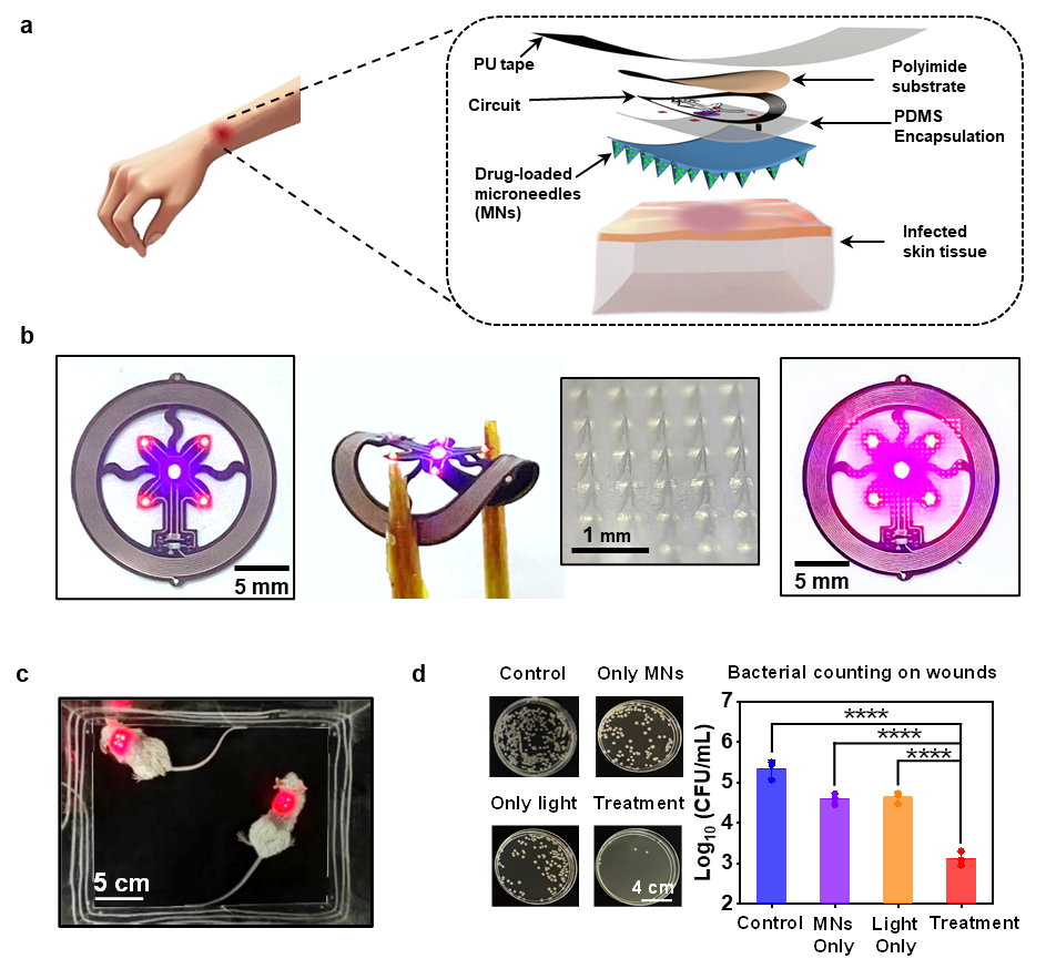 图1. (a、b) 由谐振线圈无线供能LED和可降解微针形成柔性光电贴片的示意图和实物图;(c)贴敷在自由移动老鼠背部进行无线光疗;(d)治疗感染铜绿假单胞菌皮肤伤口的菌落对比。