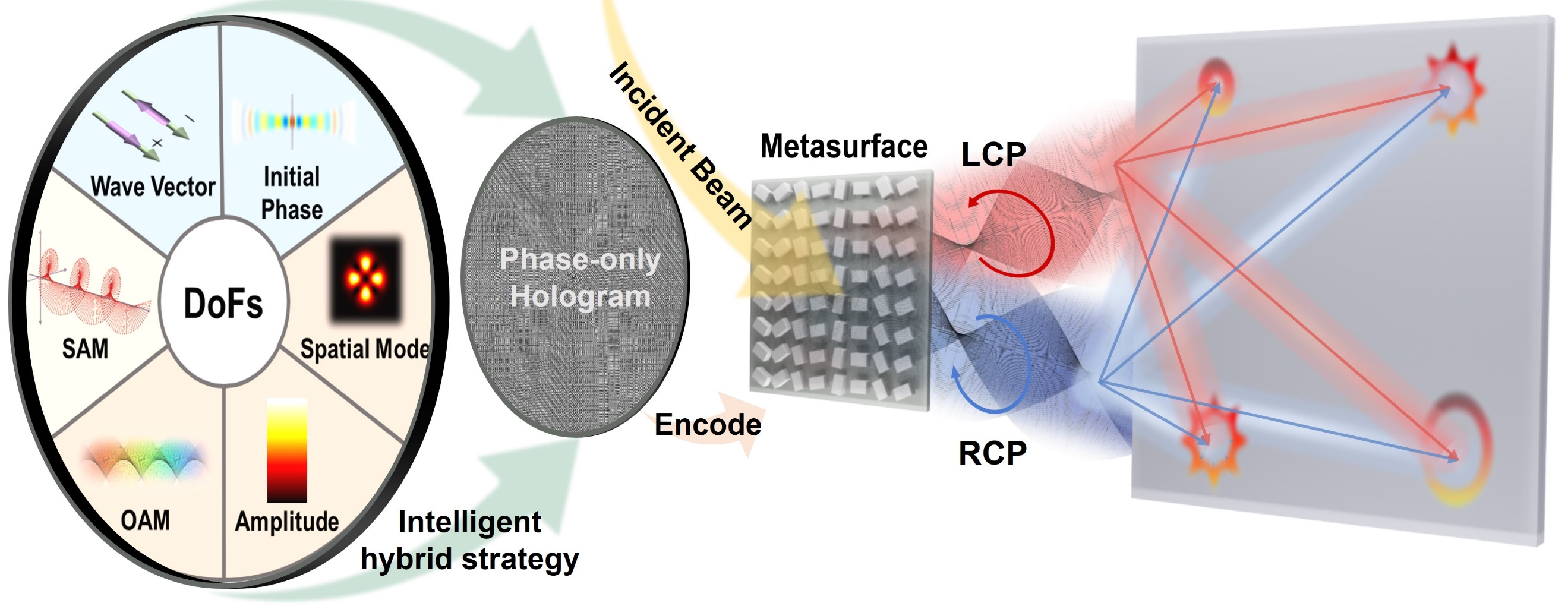 激光光场多自由的度精准协同调控及维度拓展是获得高维结构光场的核心,是光互联、光存储、光计算、量子信息等高维光场应用领域的根基。然而,现有多自由度调控技术往往需分步,依赖庞大光学系统或复杂元件,难以在单一器件上同时调控多个激光自由度,且调控维度有限,成为制约高维光场调控集成化发展的瓶颈。如何在保证调控精度的前提下,通过单一光学器件实现光场多自由度的按需协同调控,实现真正的高维光场定制,是亟待解决的关键科学难题。