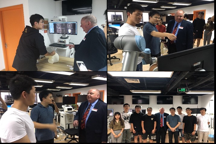 交流访问期间,Greivenkamp教授还受邀参观了学院部分实验室与创新创业公司。首先,pg娱乐电子游戏李艳秋教授向Greivenkamp教授详细介绍了课题组在高分辨光刻技术、偏振传感测量以及生物医学应用方面的概况与取得的应用成果。Greivenkamp教授与课题组研究生进行了深入交流,指导研究生如何开展科学研究。随后,Greivenkamp教授参观了王涌天教授团队杨健老师艾瑞迈迪医疗科技有限公司和程德文老师耐德佳科技有限公司。在艾瑞迈迪公司内研究人员向教授详细介绍了目前正在开发的基于增强现实的鼻内镜手术导航系统、超声引导肝脏肿瘤消融系统以及骨科导航系统。在耐德佳公司内研究人员向教授详细介绍了目前正在开发的头戴式轻便近眼显示系统。Greivenkamp教授十分赞赏我院在知识产权转化和社会服务中所取得的成绩。