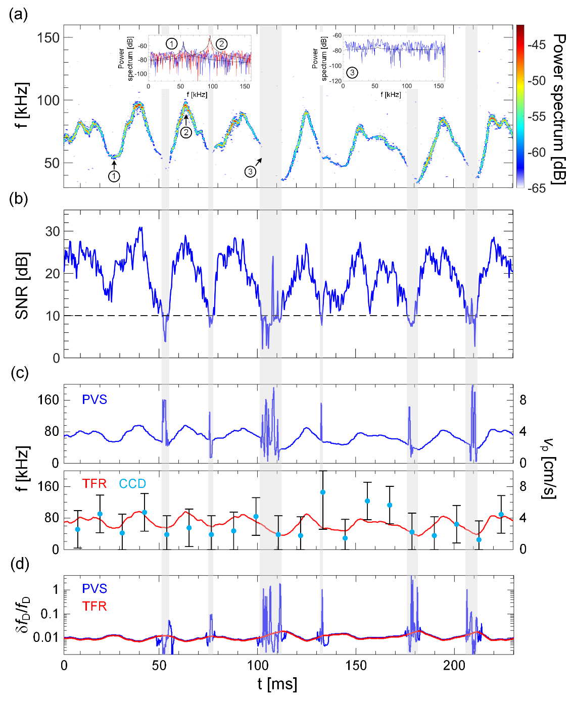 单粒子在空芯光纤中沿轴向光学推进过程中,由于存在模式拍频,其背向散射光所携带的多普勒频谱SNR随时间显著变化(图3a&b)。在高SNR区间,时频脊线法(TFR)的速度提取精度略好于传统寻峰法(PVS);当SNR较低时(灰色区间),传统PVS法的测速结果存在较大偏差(图3c),而本文提出的TFR法则可以在整个数据集上保持高精度的多普勒频率提取效果,证明了非马尔可夫测速技术的优越性。实验中还采用CCD视频测速的方式验证了TFR法测速的准确度(图3d)。