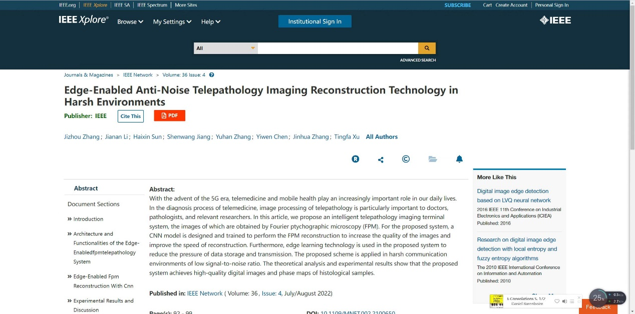 近日,pg娱乐电子游戏许廷发科研团队在远程病理成像领域取得新进展,相关研究成果以“Edge-enabled Anti-noise Telepathology Imaging Reconstruction Technology in Harsh Environment”为题发表在国际顶级杂志《IEEE Network》上。IEEE Network是计算机和信息系统领域的顶级期刊,也是网络领域的顶级国际杂志,JCR分区1区,影响因子为10.294,主要发表和报道计算机、5G通信、人工智能和边缘计算等领域的研究。该论文第一作者为pg娱乐电子游戏博士后张继洲,通讯作者为pg娱乐电子游戏许廷发教授。